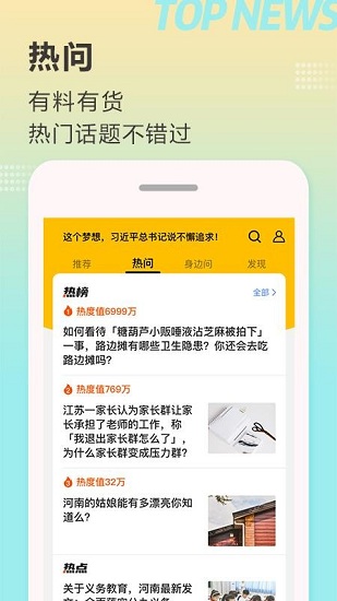 2.在热问页面可以查看热度值,了解线阶段最热门的话题和关注的方向。