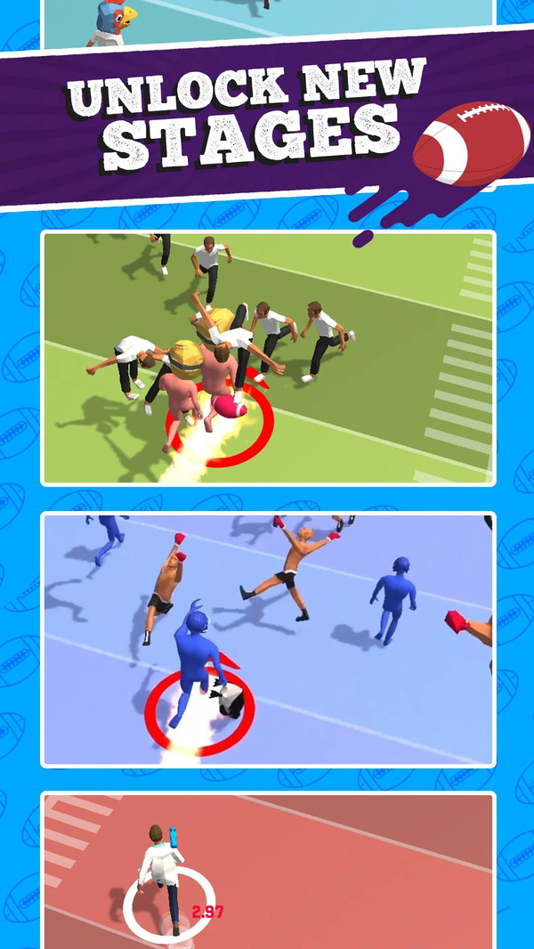 橄榄球冲锋是一款十分有趣的体育竞技游戏,游戏中玩家们将会参与到一场颇为有趣的橄榄球比赛之中,完全跟随着游戏的节奏来了解,组建你的球队,运用改进后的全新触摸控制和游戏模式,操控进攻和防守的运转!运用全新、直观的点击和划屏控制。要当心您的对手,他们会竭尽所能阻止您! 您可以通过滑动来控制玩家,一旦松开手指,角色就会将球扔给队友,不要忘记计算角度! 欢迎下载体验。