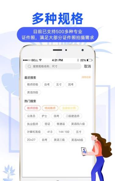 3.支持各类考试报名到各国签证在内的近500多种证件照规格;满足市面上各式各样的证件照规格要求。