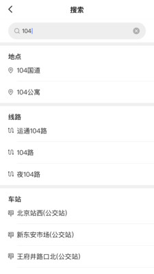支持搜索目的地、车站名称或公交路线,查询后可发起路线规划;