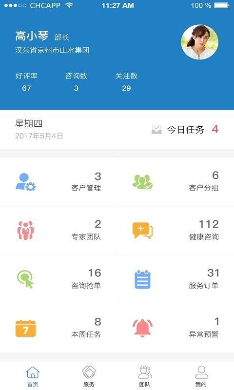 健康云专家软件是一款以人为中心、以家庭医生团队、社区护士等卫生技术人员组成家庭医生助理的专业健康管理软件。健康云医生会以电话或上门的方式为用户进行健康数据的采集,并通过云端把据上传至用户个人健康档案系统。可快速查看工作任务和信息汇总;患者异常预警、患者咨询、咨询抢单、服务订单、客户管理、客户分组、发布健康管理处方,组建或加入专家团队等功能。用户可以通过该软件实现患者管理、异常预警、发布处方等功能,并且还可以创建专业的健康团队,为更多的人提供健康服务。