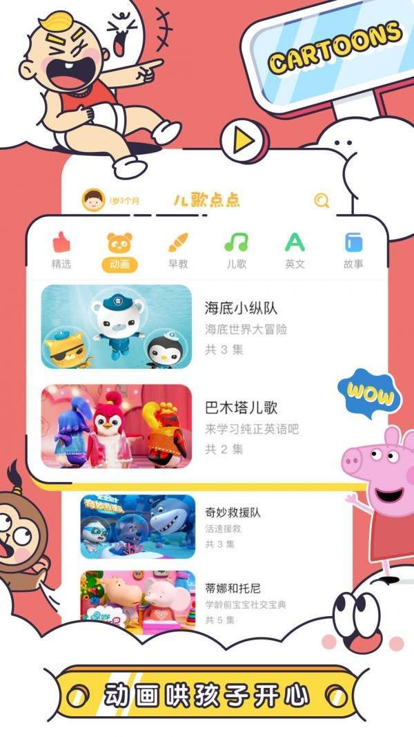 儿歌点点软件为幼儿定制了操作界面,宝宝单独操作无任何压力,有时间锁帮助宝宝按时休息,保护宝宝视力。能让一个小朋友学习各方各面的知识,比其他儿童先一步了解将来要学的知识。软件不仅能给孩子们进行知识学习,还能开发孩子们的智力,帮助孩子们养成良好的生活学习习惯,是早教育儿必备!内容丰富,知识学习,智力开发,习惯培养,性格养成,止啼哄睡,应有尽有!正版资源,高清音质,儿童专属画风,精选内容寓教于乐,宝宝开心爸妈放心!是父母早教不可或缺的小帮手,快来下载使用吧!