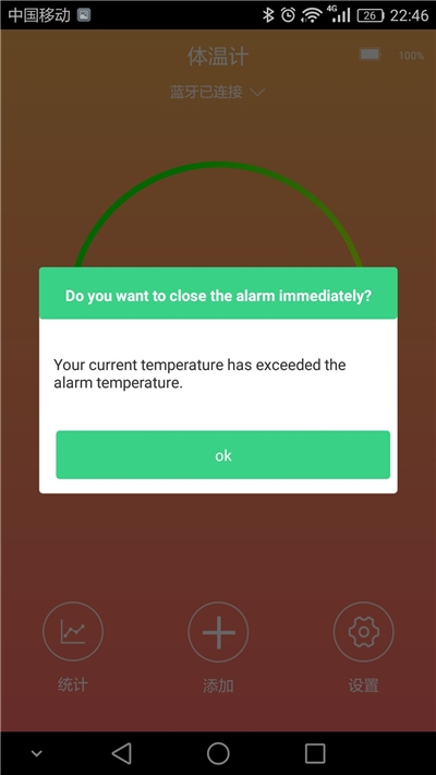 2、用户在测体温的时候,如果体温达到预警值,系统会自动出现警报提醒;
