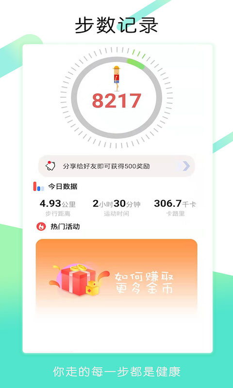 1.准确记录每天步数,运动时长、累计路程一目了然;