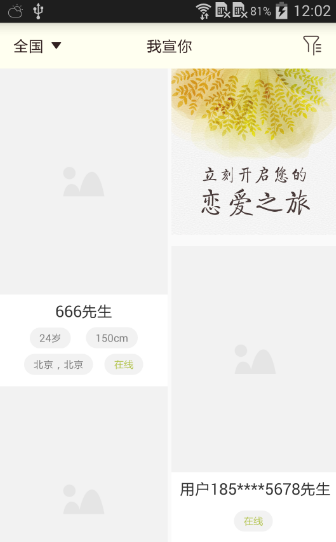我宣你社交app手机版下载是一款在线婚恋交友手机软件,如果你已经适龄,还单身,同时又想找个另一半,那就下载这款软件吧!在这里有一群单身男女,你可以积极交友,抓住这个托单的好机会哟!你可以在上面轻松一键进行寻找自己合得来的朋友进行聊天交友哦,也可以在上面进行寻找自己心仪的另一半哦。我们致力于提供一个简单、真实的交友环境,让单身男女有更多接触异性的机会,快来下载体验吧。