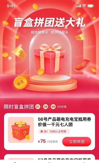 能够让用户在线与其他用户进行拼团购买,可以更加省钱的购买盲盒,让用户拥有不一样的惊喜!