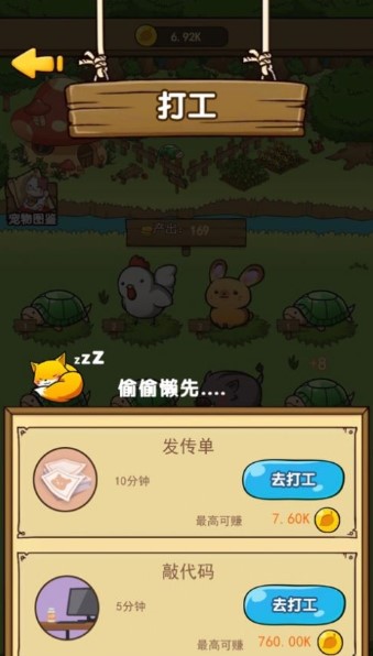 1、选择不同的宠物进行打工,获得不同数量的金币收入,解锁全新的宠物;