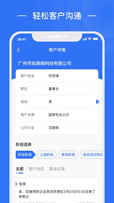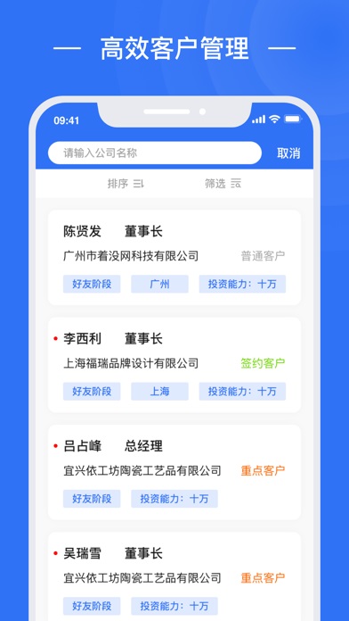 天九客户管理软件是一款内容非常丰富,使用非常方便的办公软件,软件汇聚公司创始人、董事长、CEO、总裁等上百万家公司的首要决策者;创建商务社交人脉、资源互助、合作的安全诚信社交环境,为企业家量身打造线上线下相结合,融资投资多保 障,企业内外强人脉,管理智慧全分享,定向约见无障碍的超级App。没有杂乱的广告介入,包含信息录入、业务管理、和客户沟通等功能,这么实用的软件,你还在等什么呢?赶紧来麦氪派下载体验吧!
