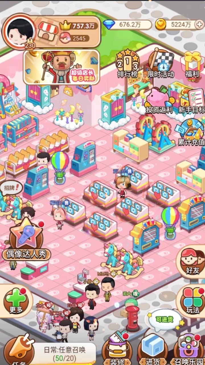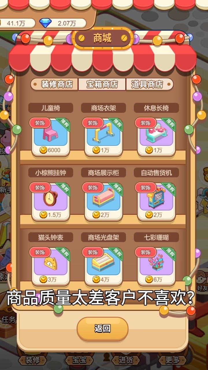 3.升级超市中各种类型的店铺,来解锁更多的商品进行售卖,同时也可以获得丰富的金钱。