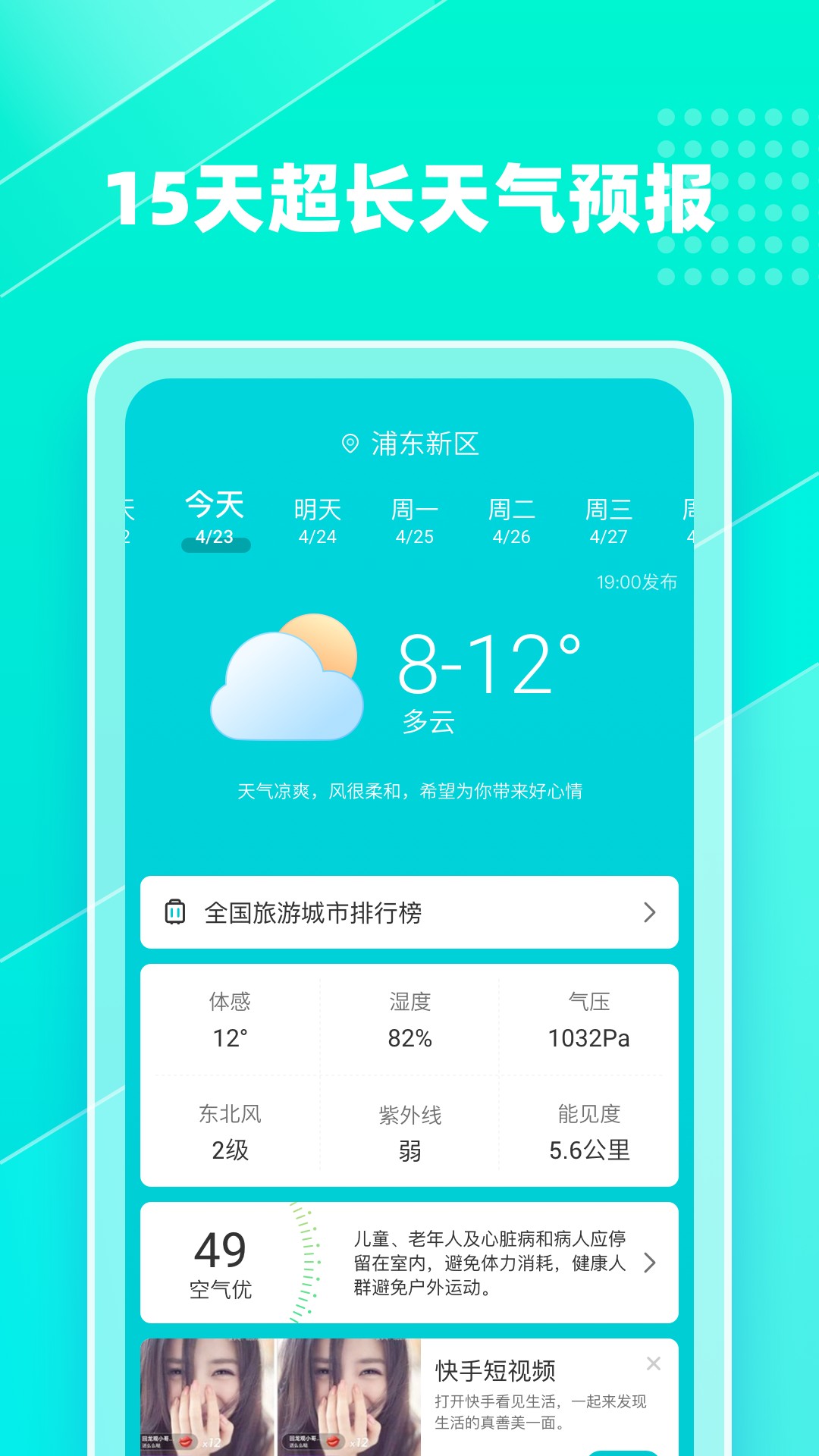短时预报:精准、及时预报你所处位置天气情况,可查看国内城市每小时天气预报、空气质量