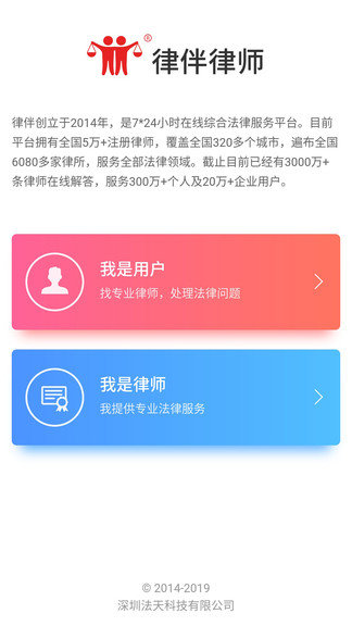 律伴是深圳法天科技有限公司推出的全国首款面向客户和律师在移动互联网交流的法律服务平台。律师可以通过手机APP,电脑网页和手机网页等多种形式登陆律伴律师,当然,律师注册律伴律师还需要一个资质审核,律师需要上传自己的律师资格证方可注册成功,这点也是律伴为了保障所有使用律师的资质和权威,以及提升用户的信任度;以及律师在注册律伴律师的时候,需要选择3个自己熟悉的行业领域。