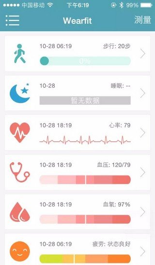 Wearfit APP中关于健康数据测量主要包括:运动计步、睡眠监测、心率测量、血压测量、血氧检测、疲劳度测试六大模块,点击主界面中右上角测量按钮可一键测量心率、血压、血氧、疲劳数据,得到相应数据。点击相应的测量项进入操作页面有实时测量数据功能和结果及日周月平均、最高、最低数据,数据结果可分享至各大网站社交账号。用户在掌控自己的身体状态同时也可与家人朋友分享自己的健康情况。
