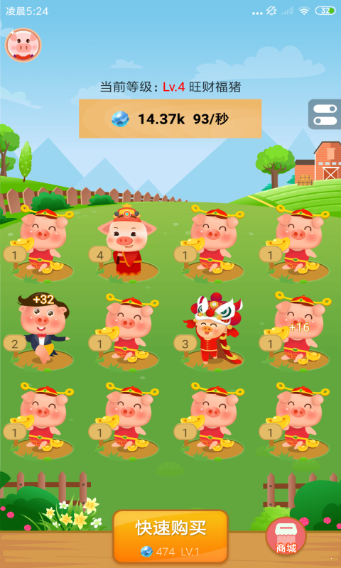 2、可以将两只相同等级的小猪进行合成,升级小猪,得到大量的红包;