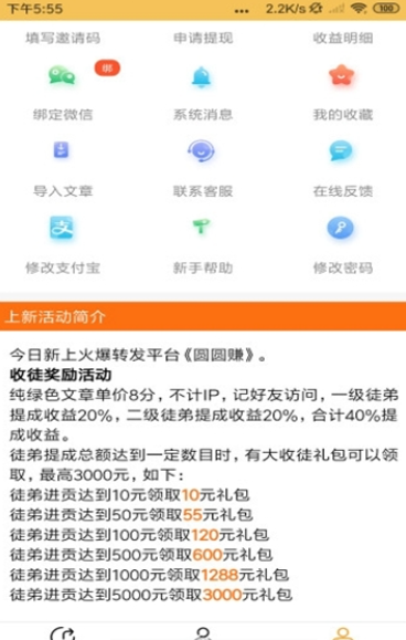 1.转发赚钱单价0.32元,分享到微信群及朋友圈,阅读越多赚越多。