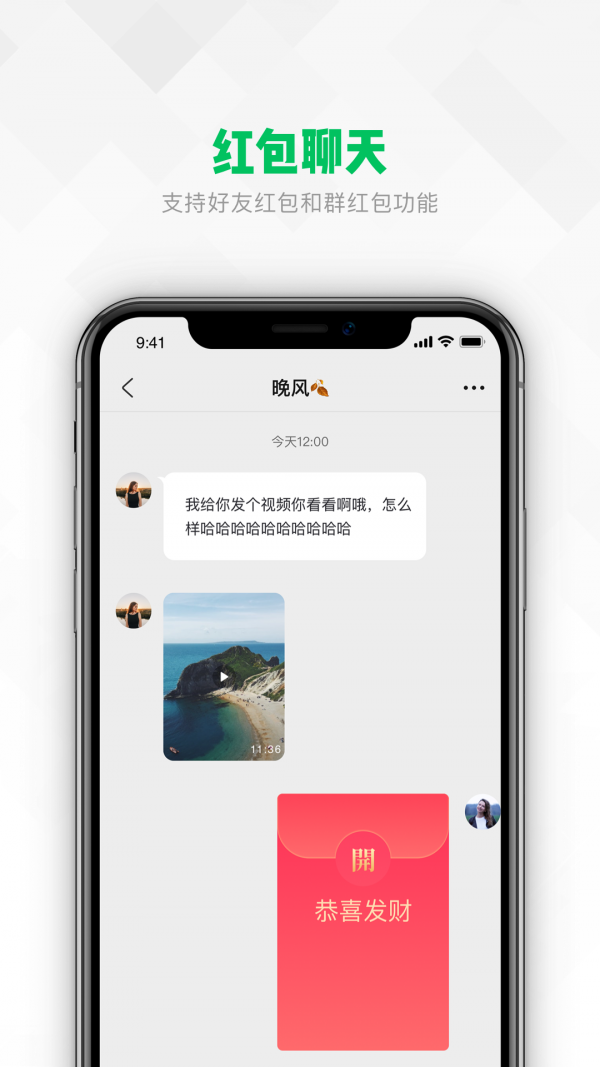 红包聊天,支持好友红包和群红包功能,过年过节过生日,给好友发个红包庆祝一下吧。