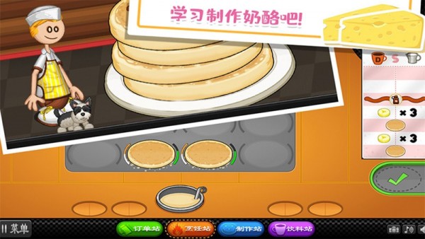 3、只有你做的好,客人才会吃的高兴,一共有四个站点需要你来完成,包括订单站、烹饪站、制作站和饮料站。