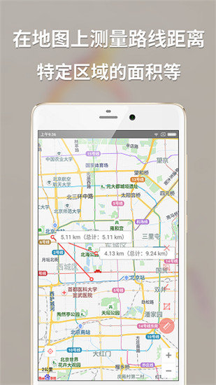 1.地图测量:利用GPS与地图数据,在地图上直接测量路线的距离,特定区域的面积等;