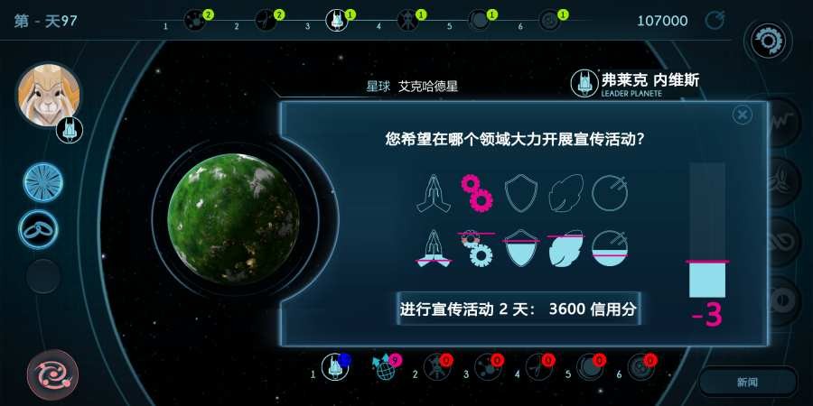 3、玩家需要不断在各个星球召开新闻发布会来随机改变系数同时还需要进行宣传来改变指定的系数。