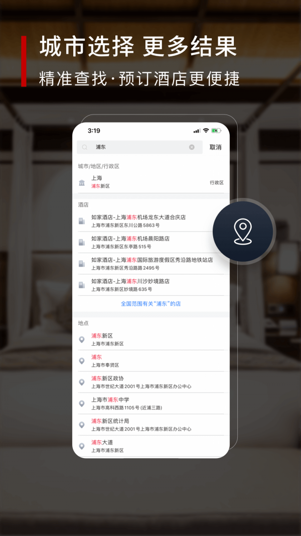 覆盖旗下四大品牌---如家、莫泰、和颐、云上四季,可预订全国300多座城市2200多家酒店;