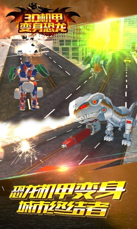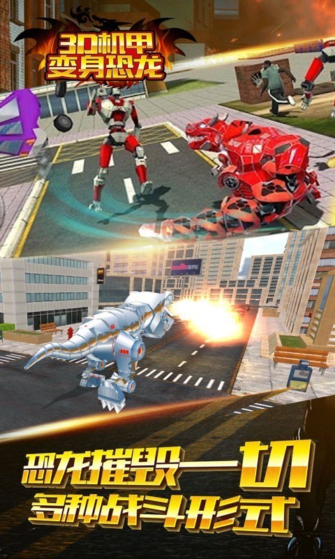 3D机甲变身恐龙作为一款好玩的动作游戏,炫酷逼真的3D全景画面下让你感受不一样的刺激内容,动用自己的武器和智谋歼灭所有的对手,赢得胜利破坏城市!游戏中的主角是机甲恐龙,精美的3D建模设计霸气的机甲恐龙,每一只恐龙都有着双重形态,第三人称视角下的动作射击,玩家可自由操作恐龙变身战斗,射击的武器是每一只恐龙自带的强大杀伤力技能,和庞大的身躯去战斗,你的目标是消灭掉所有在城市犯罪的恐怖份子,在这个复杂的现代都市犯罪份子很多,一定要把他们全部杀掉!