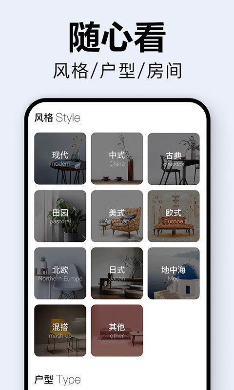 - 多样风格,包含简约、现代、中式、欧式、美式、田园、地中海、日式、东南亚、混搭、新古典等14种风格;