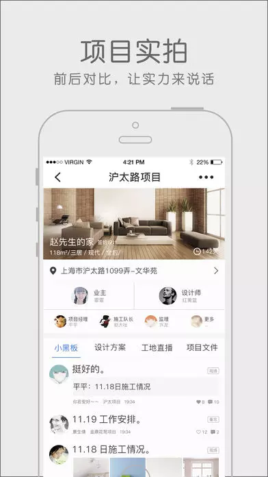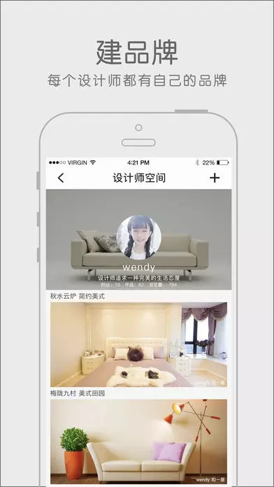 设计师空间,方便的看设计师的设计案例、实际工程的装修结果,了解设计师的风格和专业能力,找到自己喜欢的方案,并和设计师充分交流,最终选择自己满意的设计师。