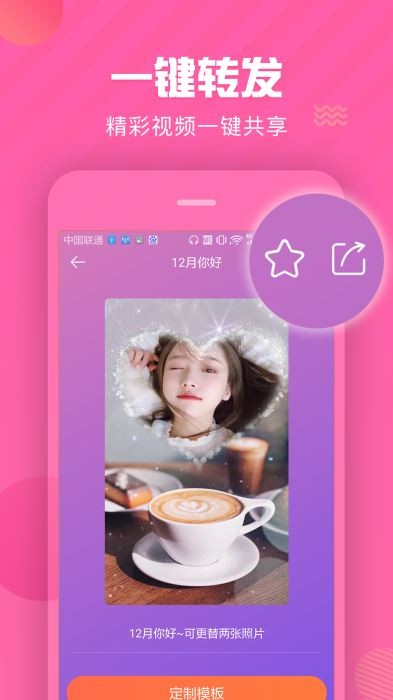 2.热门视频模板,热点视频爆款模板随意挑选,万花筒、情侣、微商、姓氏花样模板应有尽有。支持一键分享你的精彩视频,丰富社交生活。