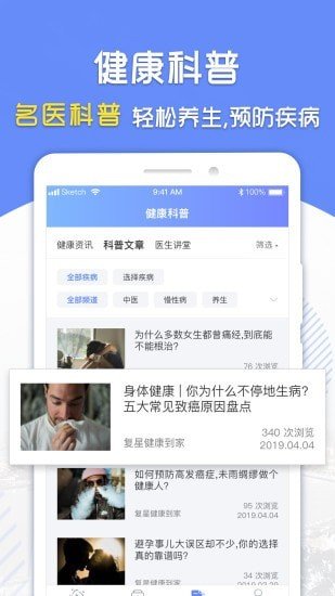 复星健康app是一款不错的是医事服务软件平台,软件可以大家提供线上问诊等服务,用户随时可以咨询线上医生相关的身体病状疑症,医生都会为你进行详细耐心的解答的,平常软件也会为你推送相关的健康指导建议,帮助您养成一个良好的生活习惯。复星健康app拥有资讯,健康课堂,测量提醒,商城等等诸多功能服务,复星健康app可以帮助用户更健康生活。快来麦氪派站下载体验吧。