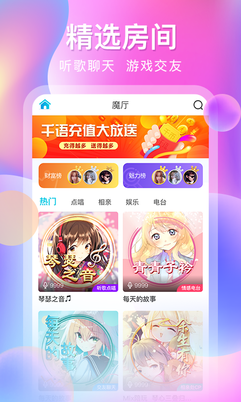 千语空间app,一款专注语音聊天的交友平台,时下超级火爆的声音交友app,千万热爱社交、热爱声音的年轻人聚集地,玩转空前独特的交友方式。 千语,以声音为一段关系的起始点,隐匿身份、外貌等现实条件的限制,开启纯粹的声音交友之旅。 每个声音都是独一无二,无论你的声音是低沉的,轻快的,逗趣的…..总有一个人喜欢你,让我们用声音相伴,温暖前行。快来麦氪派站下载体验吧。