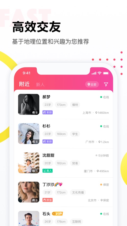 2、『高效交友』通过地理位置和兴趣爱好为你推荐最有趣的人;