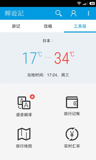 【工具箱】旅行工具箱为用户在旅行的过程中提供一些简单的服务,例如查看旅行地的气温、时间等等基本信息,工具箱还提供语音翻译、实时汇率、旅行记账、行程地图功能。
