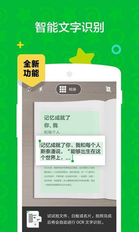- 拍照扫描书籍、纸张、板书和名片等,将信息数字化保存