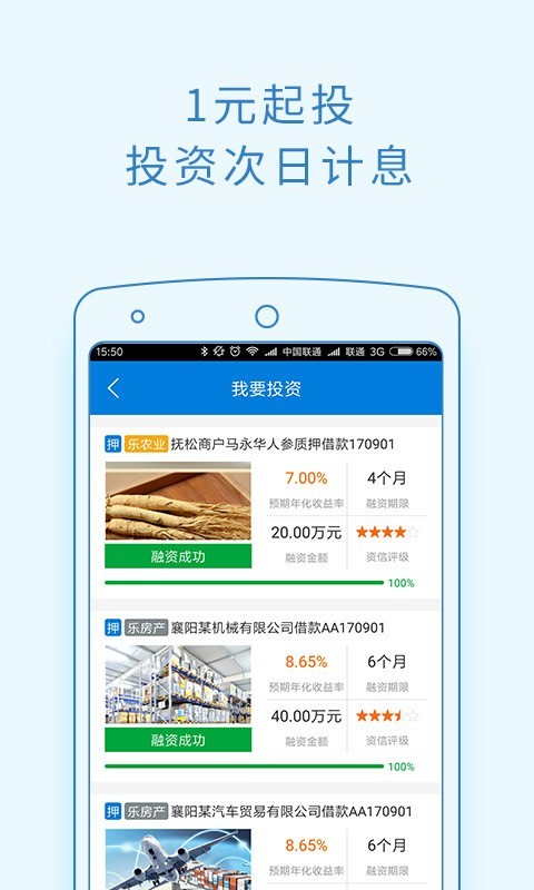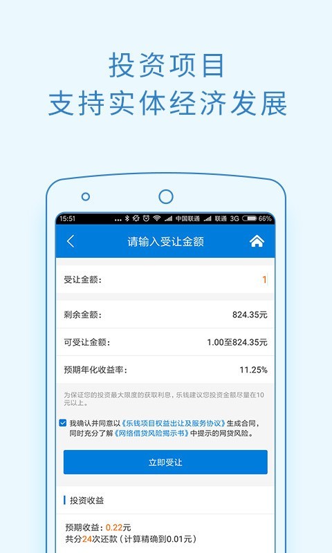 4、用户在乐钱平台上投资项目,投资门槛直降至1元,普通用户也可享受“高净值用户待遇”;