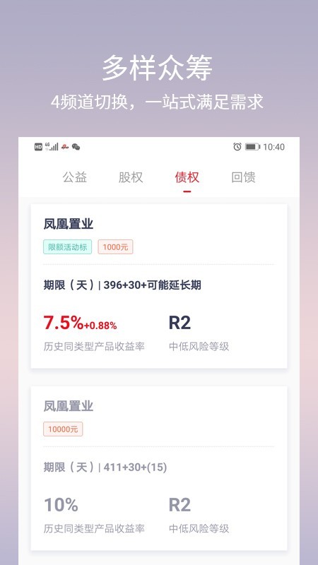 凤凰众筹app是一个众筹信息中介服务平台,凤凰众筹app支持众筹的项目形式多种多样,包括公益、股权、影视、科技等等,用户和项目方可在平台交易。凤凰众筹app——指尖上的普惠金融,动动手指成就梦想!投资人可找到优秀的影视作品、前沿的新奇产品、稳健的股权项目,预约私募基金,查询企业征信等等。创业者可发布新项目、新产品、新思路,在线直播项目路演,即时交流投资人,迅速实现创业梦想。睿智多金的投资人和踌躇满志的创业者,请下载凤凰众筹APP,咱们一起成点事儿!