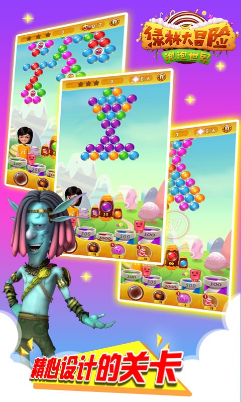 泡泡粉碎经典泡泡龙玩法里面加入BOSS战,还有其它丰富特色玩法。多种搞怪道具供你使用,激萌宠物供你选择。魔法快乐之旅由一段美丽的故事带你进入。前所未有的体验,快用你手中的泡泡一起去冒险吧。
