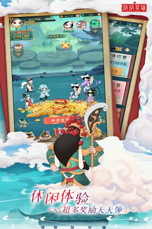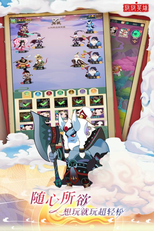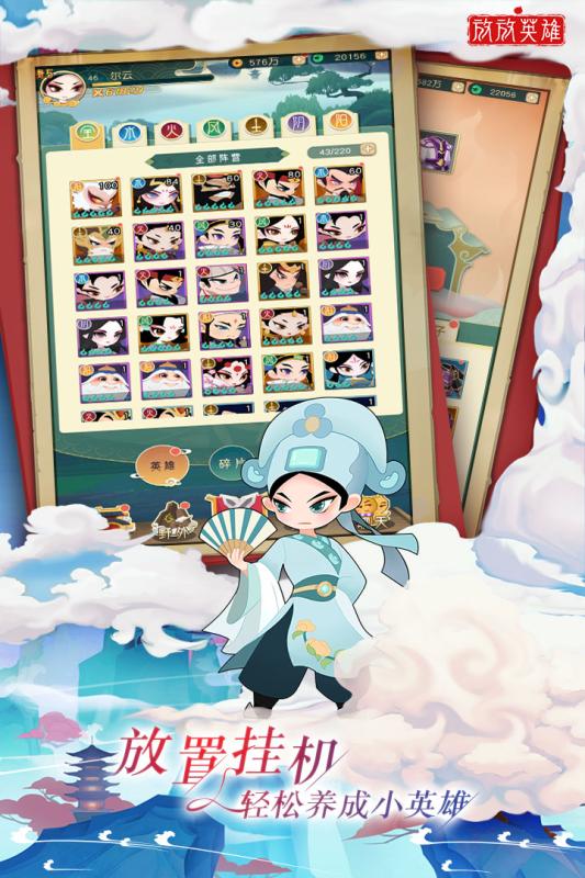 放放英雄是一款以西游为背景故事而且融合了中国传统戏剧元素的角色扮演类放置闯关游戏。数十位西游中的经典人物等待你的解锁,不停的升级你的英雄,打造自己的最强战队。高度自由的属性搭配,每一个不同的组合都有可能释放出史无前例的强大能量。还有放置的游戏玩法,不会占用你太多的游戏时间,下载放放英雄游戏,赶快来体验吧!