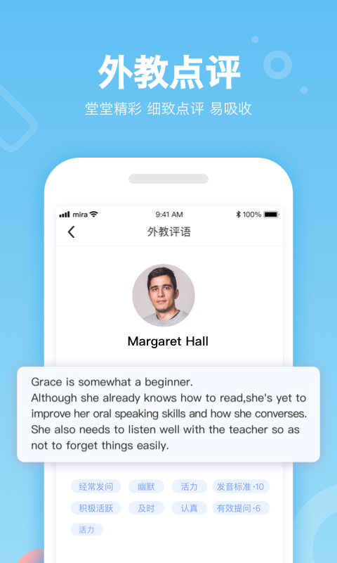 2、所有米拉外教均来自以英语为母语的国家,具备教育行业从业经验,能够给您更好的教学质量;