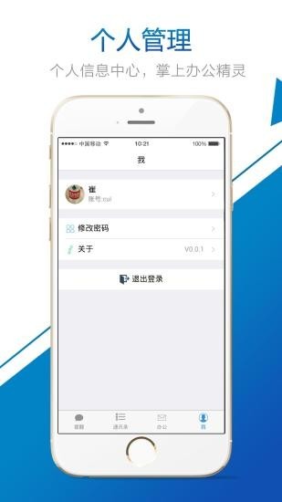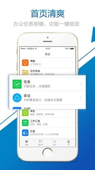 4、APP包含考勤、文件传阅、会议、日程等八大功能。