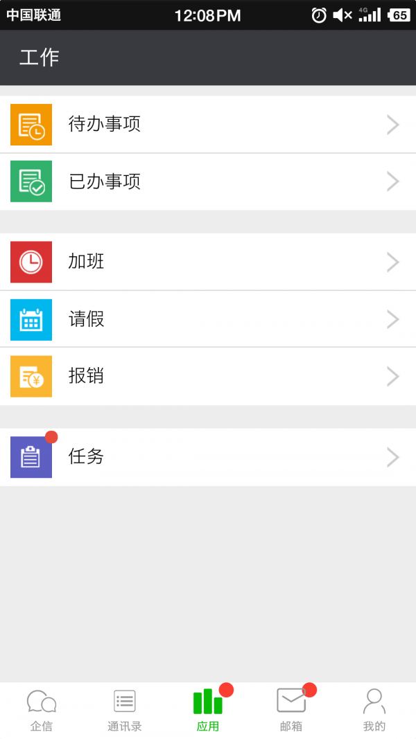 3、应用,无纸化提交请假、加班、报销。随时知晓自己的已办和待办事项。