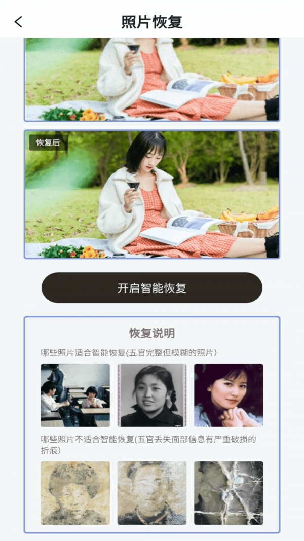 3、能够帮助用户对一些年代久远的老照片、糊照片、旧照片,轻度破损照片进行智能的修复;