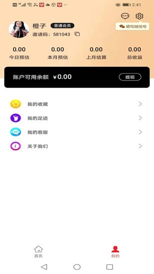 5、在我的页面,就能了解余额、收藏、足迹信息,还能在线提现