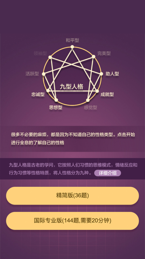 九型人格测试是款可以免费体验的性格测试类游戏,让你可以在九种性格中找到属于自己的,让你可以更好的了解自己的性格,给你一个非常不错的参考,您可以通过此游戏快速的测试出您的人物性格,看看您是哪种类型,取长补短,方便自己以后做出最合适的打算!