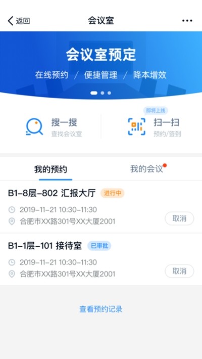 4、会议室预定:会议发起后,发起者可继续补充邀请参会人员,被邀请者也可邀请他人参会;会议详情中增加事件记录功能,会议发起者可以清晰地查看参会人员的响应情况;