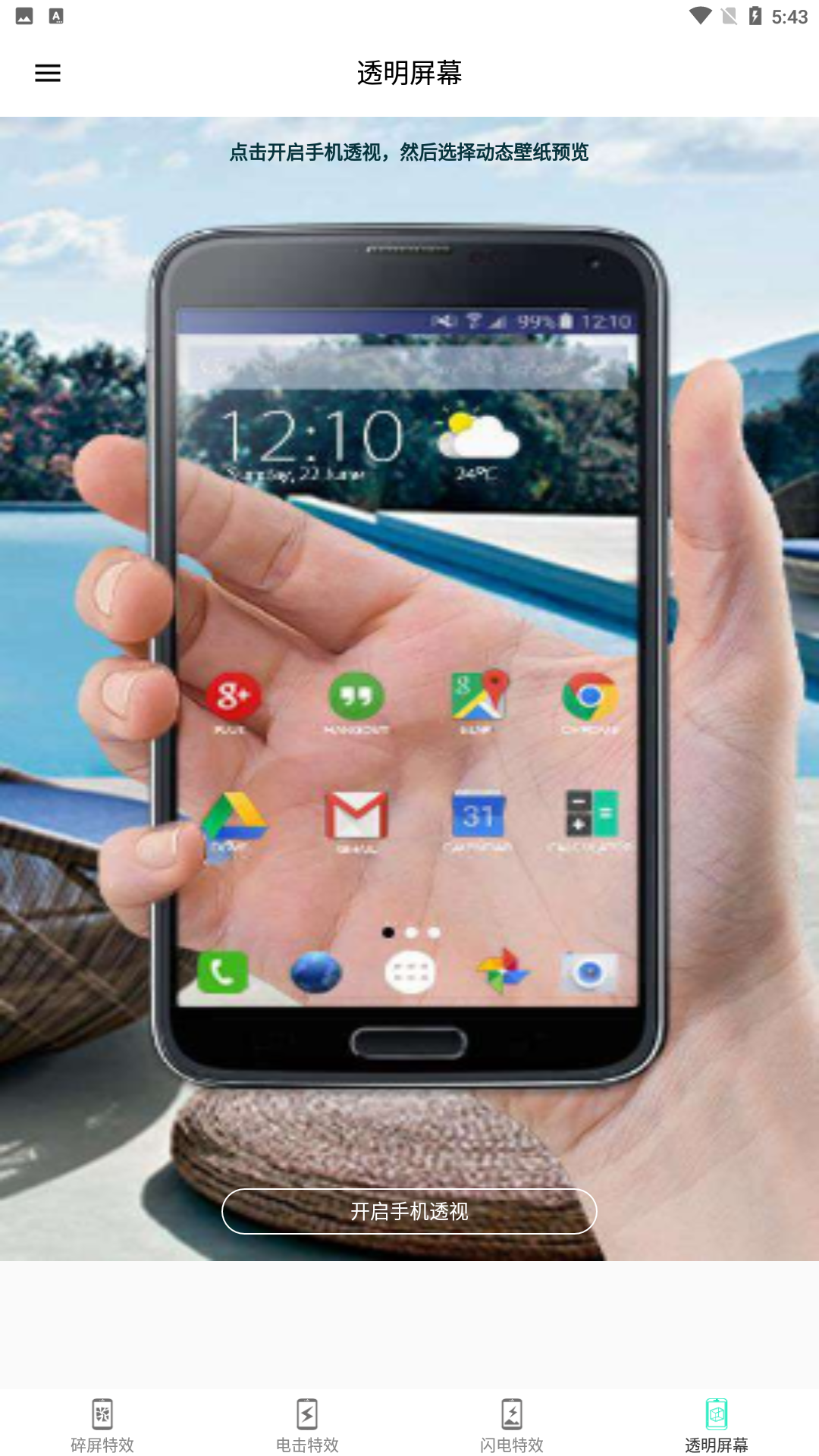 开启应用,设置碎屏特效。用手指触碰屏幕时听见”砰“的一声,屏幕玻璃”碎裂“了