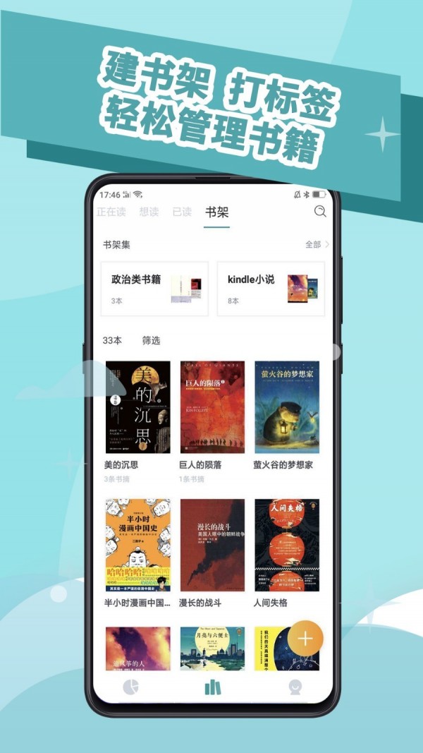 4、书籍管理:用户可以通过扫条形码、搜索的方式添加书籍。添加的书籍可标记为正在阅读、未读书籍两种,查看阅读进度、阅读类型、记录读书笔记,轻松管理。