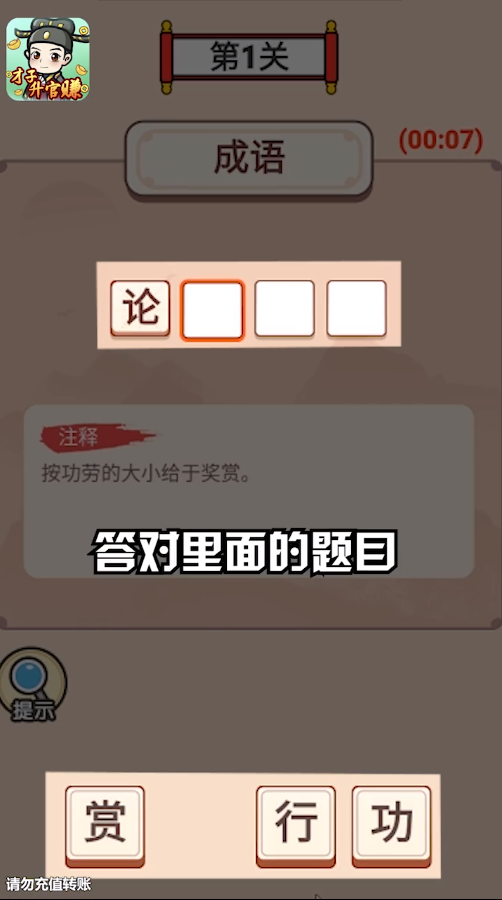 才子升官赚是一款解谜闯关类游戏,有着丰富多样的成语关卡等着你的解谜,运用不同的方法来解答麻烦的成语谜题,找到各种不同的答案,使自己在答题挑战的过程之中能够获得跟高的分数,能够轻松的战火诸多的红包奖励,趣味的成语答题玩法模式,很多的成语方面相关知识可以学习和掌握,难度会根据每个场景变换来改变,让你在汉字王国的海洋里尽情享受博大精深的文化熏陶。