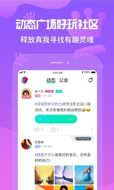 一键发布动态,在这里的广场之中不仅可以发布语音动态而且图文动态也能分享;