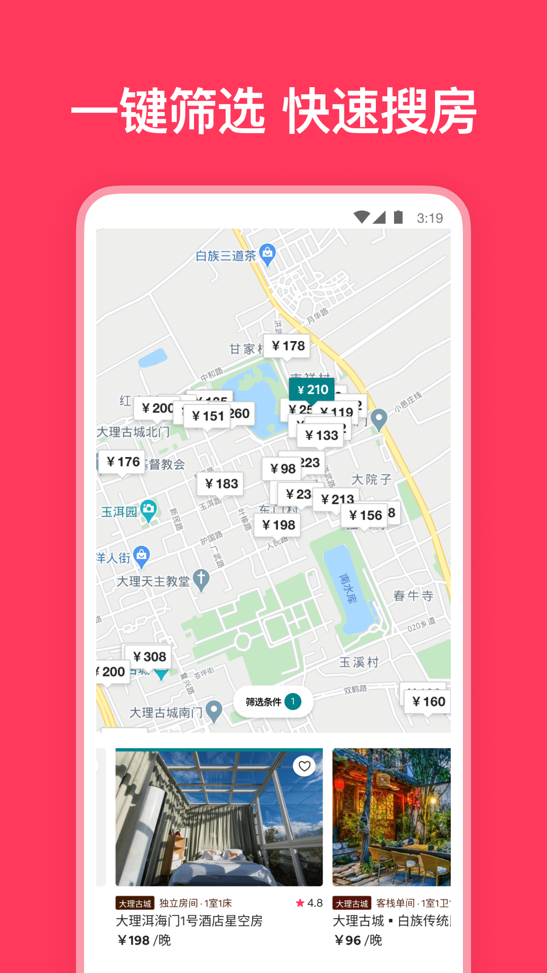 选择自己喜欢的民宿房源风格和期望的价格范围,一键查看房源照片, 快速了解民宿介绍和房东背景,筛选适合自己的民宿客栈和短租公寓,轻松预订旅行中