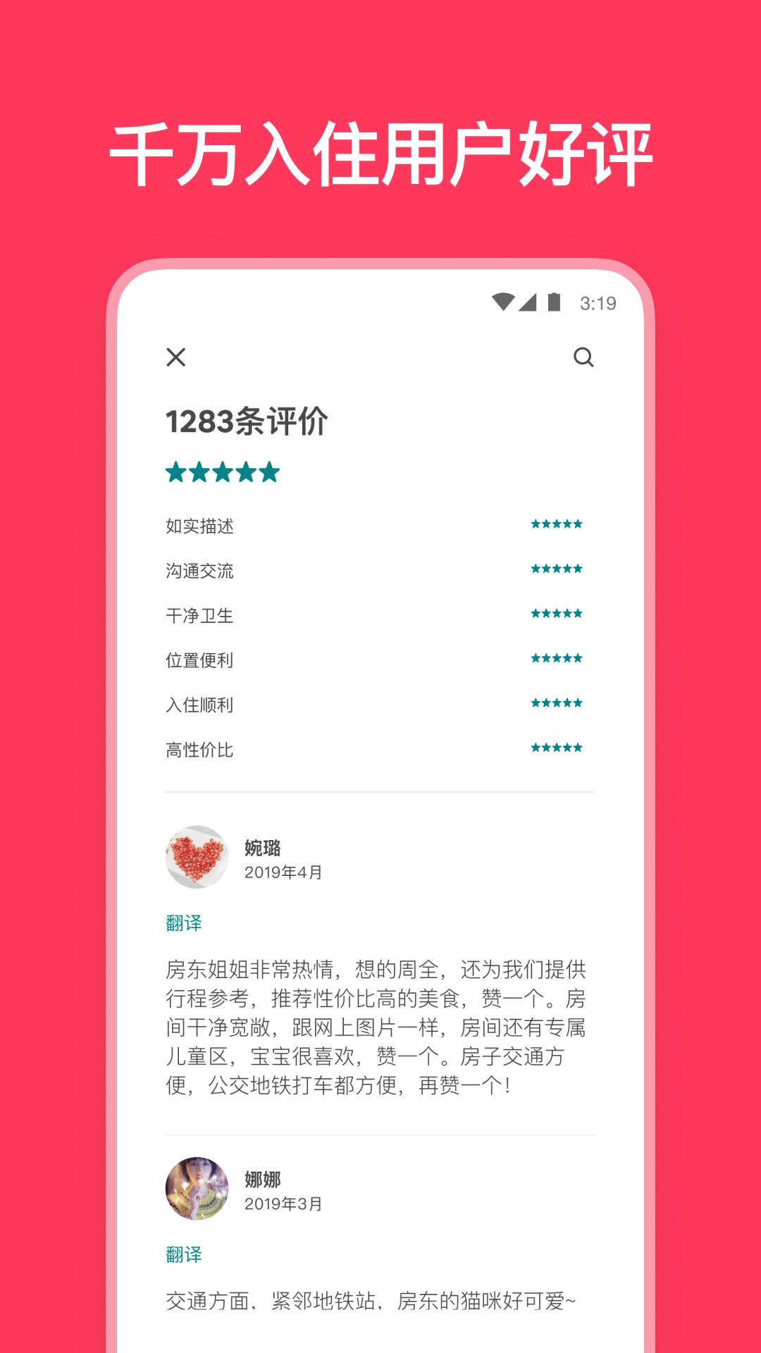 用千万用户在Airbnb爱彼迎平台上的真实评价做民宿选择参考:房源干净、交通便利、家有萌宠、床品舒适、入住方便.... 你可以阅读其他房客的旅游体验,