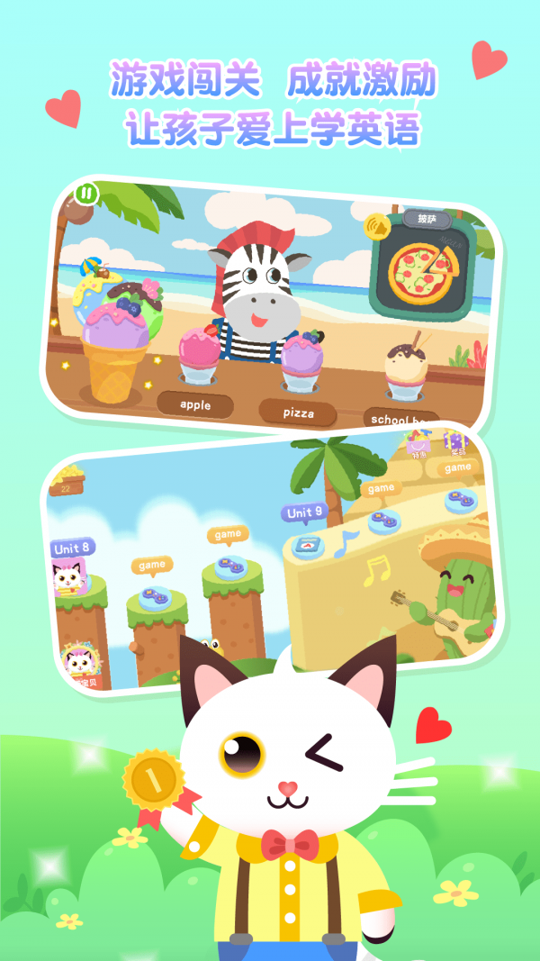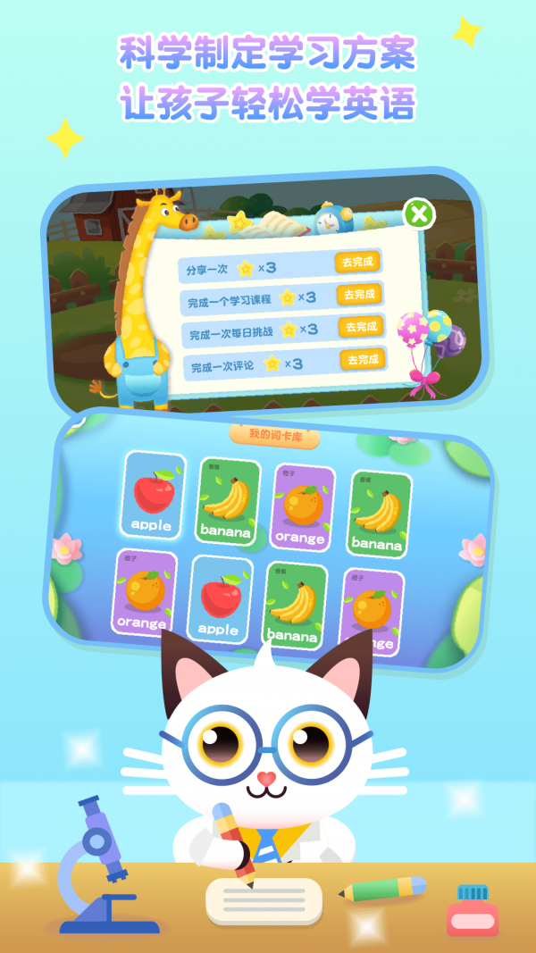 喵喵少儿英语app安卓版专为2-6岁宝宝提供有趣、高效、贴心的英语启蒙,从听、说、读三大操作,以每日打卡学习、游戏教学法为核心,让孩子轻松爱上学英语。